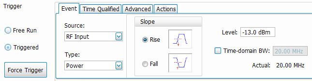 In this example, a simple RF Power Trigger at -13 dBm is used to initiate the acquisition: