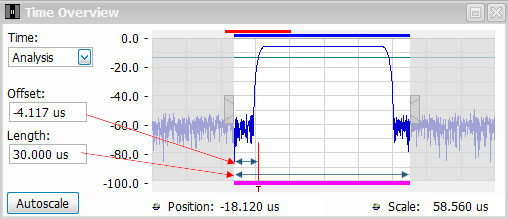 The Analysis Offset and Length are adjusted to acquire the RF signal of interest. In this case, it is a 20 μS wide RF pulse. The most intuitive way to setup these parameters is by using the Time Overview display to adjust Analysis Offset (analysis start with respect to trigger), and Analysis Length.
