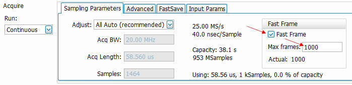 Once the RSA has been configured to trigger and acquire a single RF pulse, then the Fast Frame function can be enabled to tell the RSA how many of these acquisitions to make. This is done via the Setup > Acquire panel: