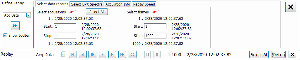 In the example above, the RSA will acquire 1000 “frames” into memory prior to processing and analyzing the results. If the RSA is setup to Single Run Mode, the single acquisition will consist of the 1000 frames of data. The Replay Control toolbar and dialog illustrates the structure of this acquisition – in the case, a single acquisition consisting of 1000 frames of data. In the Replay Toolbar, you’ll see “1:1000” which indicates that the current analysis displays reflect the 1000th frame in the 1st acquisition.