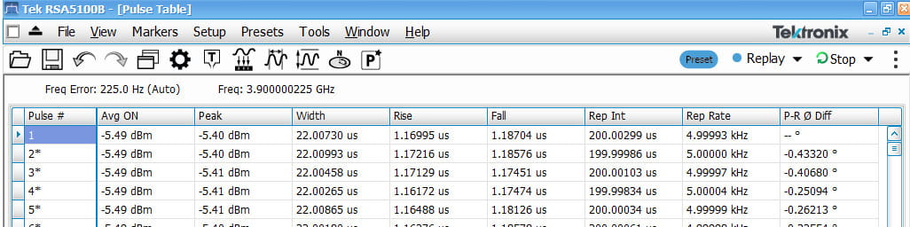 Here is an example of what the Pulse Analysis results look like when analyzing Fast Frame data. Note that the pulse-reference Phase Deviation measurement of the 10MHz LFM pulse is properly performed even though there is a “gap” in the acquired IQ data. Note that the “gap” in IQ data is indicated on the Pulse Table by the asterisk next to the Pulse Number in the first column.