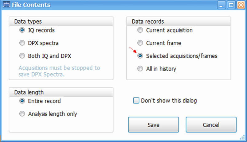 When saving/exporting the IQ data, the selected Acquisitions and Frames indicated above can be used to save only those acquisitions:frames of interest in the Save As dialog box:
