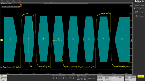 The viewing area is optimized to ensure that the maximum vertical space is available for waveforms. The Results Bar on the right can be hidden, enabling the waveform view to use the full width of the display.