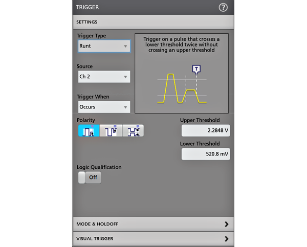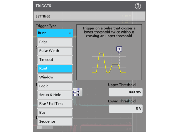 - Edge, Pulse Width, Runt, Timeout, Window, Logic, Setup & Hold, Rise/Fall Time, Parallel Bus, Sequence, Visual Trigger, Video (optional), RF vs. Time (optional)
