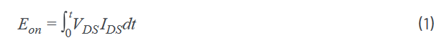 To calculate energy loss, instantaneous power is calculated and then integrated to find energy. Turn-on loss is measured by integrating power dissipation during turn-on (Figure 9, Equation 1):