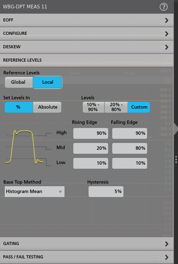 The WBG-DPT application software defaults to the industry standard 10% and 90% threshold values shown in Figure 27. It also supports custom threshold settings. The default levels are used in this example.