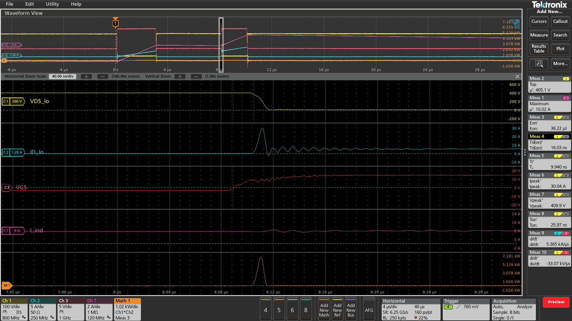 Similarly, energy losses during switching can be determined using channel math to multiply voltage and current to generate a power waveform, and using an area measurement (integration) to determine energy. To simplify this, the WBG-DPT app provides Eon and Eoff measurements under the Switching Parameter Analysis group. This measurement performs the necessary math and quickly displays the result.