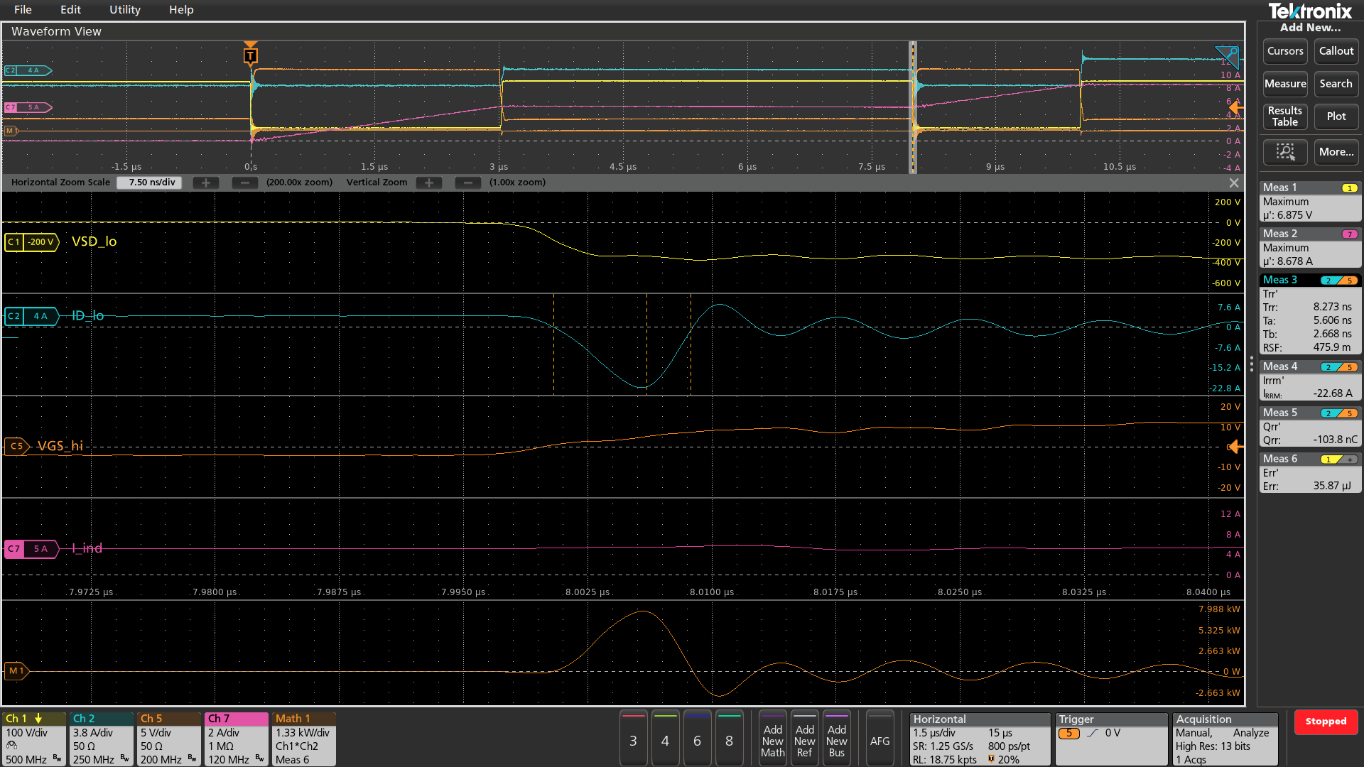 The resulting waveforms were captured and measurements were displayed on the oscilloscope. Data and settings were stored as a “session” to document the measurements. The screen capture in Figure 28 shows the detail of the turn-off event at the end of the first VGS pulse, after ID has risen to the target value.