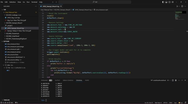 TSP Toolkit is an updated script development environment taking the form of a Microsoft Visual Studio Code extension that includes instrument support for Keithley TSP-enabled instrumentation such as source measure units (SMUs), digital multimeters (DMMs) and data acquisition systems (DAQs), plus many quality-of-life features that improve the script development experience. TSP Toolkit is replacing Keithley Test Script Builder (TSB) and features all the same functionality plus more.