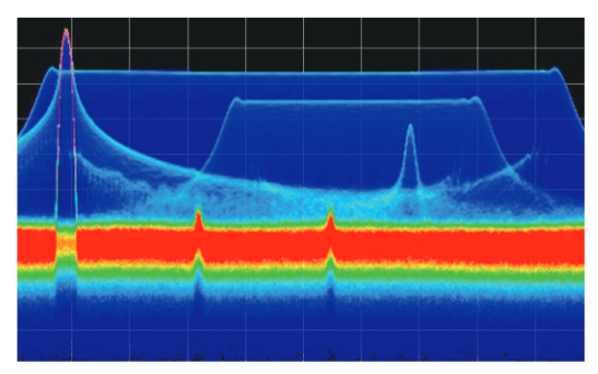 With the DPX spectrum display, the problem is rapidly visible.The very low duty cycle is the reason for such a dim blue color for the transient frequencies while the rest of the spectrum that is continuous shows as very bright red.