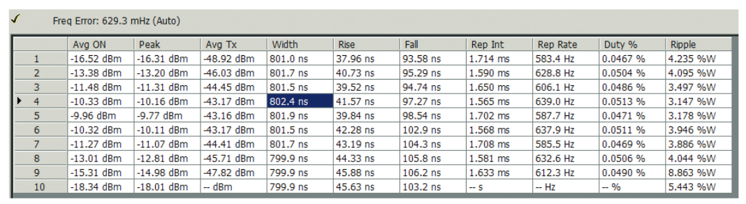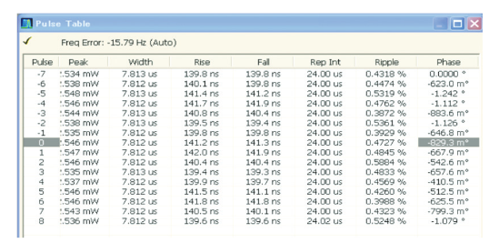 Any or all of the measurements with numeric results can be included in the pulse table display as seen in Figure 9.