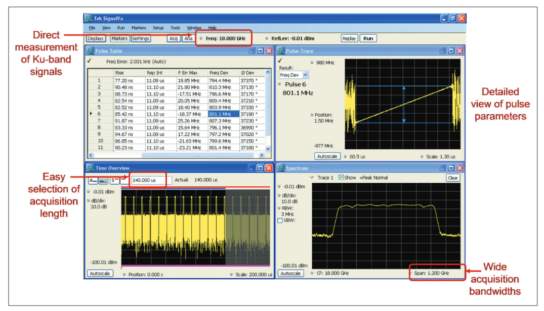 he measurements will have the same dynamic range as the oscilloscope, while maintaining its full bandwidth. Figure 10 shows a span of 1.25 GHz, and a chirped pulse that is 1 GHz wide. The frequency span capability is limited only by the bandwidth capability of the oscilloscope on which the software is installed.