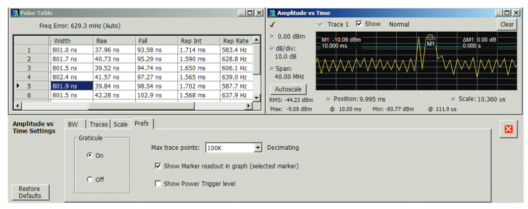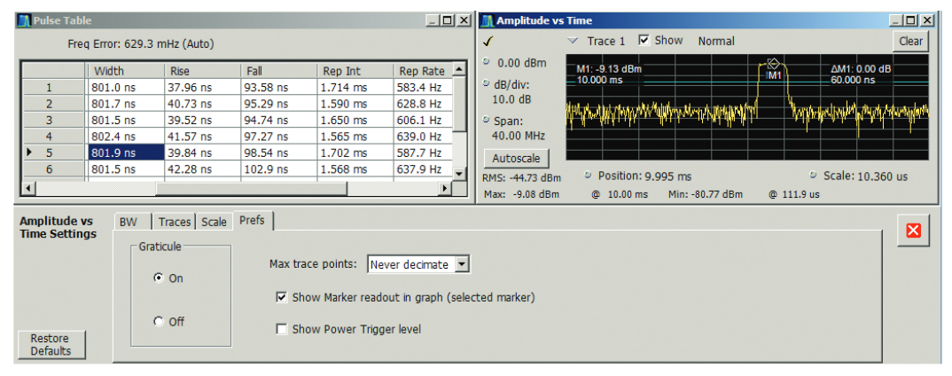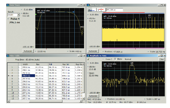 The RSA Series pulse measurement suite provides a comprehensive set of pulse parameter measurements for up to 800 MHz bandwidth, including readouts of timing,distortions, amplitude, frequency, phase and pulse time.