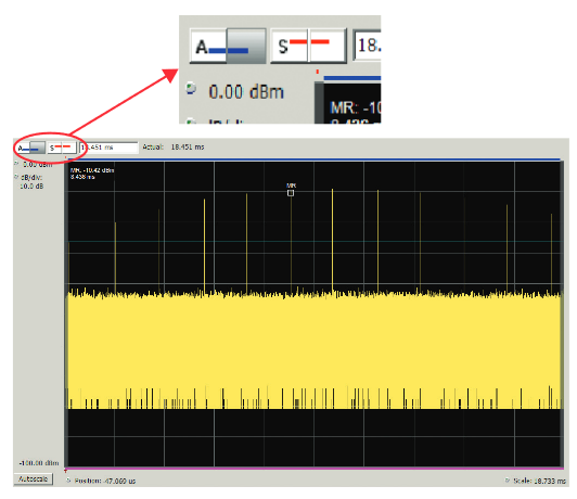 The blue bar on the top of the Time Overview measurement indicates the Analysis Time. Note that the Analysis Length and Offset (the 2 blue buttons) will apply to all displays on the instrument except the Spectrum Display. The Spectrum Length and Offset can be set with the red buttons. The minimum Spectrum Length setting will be automatically determined by the amount of samples necessary to realize the requested RBW setting when in Auto mode. For example, narrow RBW filter will require a longer Spectrum Time. The Spectrum Length and Offset are indicated by the red bar at the top of the plot.