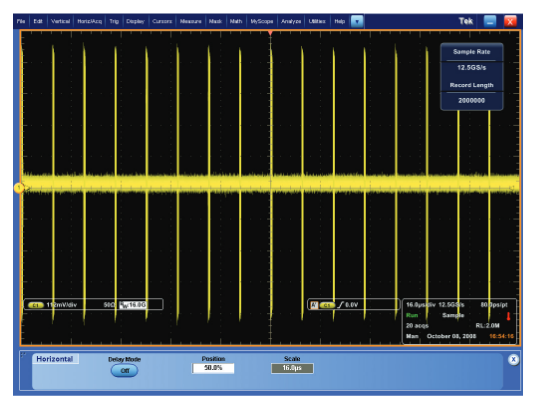 The FastAcq capability on the DPO, DSA, and MSO Series provides a time-domain display with a high waveform capture rate. The DPX acquisition technology processor operates directly on the digital samples live from the A/D converter.It discovers rapid variations or one-shot events in the timedomain display.