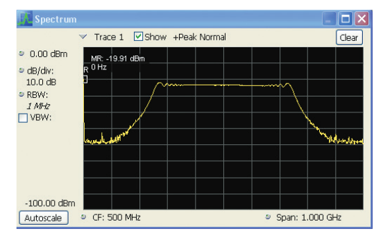 The SignalVu vector signal analysis software uses the digitized voltage waveform stored in the oscilloscope and uses the same software as the RSA Series to make all of the RF measurements. The frequency spectrum is shown in Figure 20. This pulse chirps from 250 MHz to 750 MHz.