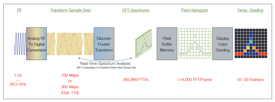 Refer to the previous Figure 5 for the RSA block diagram.The A/D converter operates continuously. Samples of whatever signal is in the IF are passed to the hardware signal processor without interruption. These samples are processed at up to 292,969 seamless spectrum measurements per second.