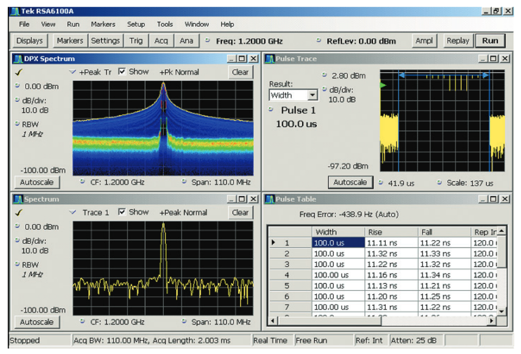 While the RSA Series can be used in a manner similar to the swept spectrum analyzer to measure in either the frequency domain or the time domain, automated pulse measurements are available that offer much more signal detail and measurement repeatability. The Advanced Signal Analysis suite, Option 20, includes the pulse measurement capability. For this analysis, the analyzer stores a digital acquisition, finds the pulses within it and measures a full set of parameters for each pulse. Timing, frequency and phase parameters are all measured. Any selected set of these parameters can be displayed or exported.