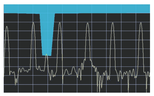 For triggering on specific frequencies at specific amplitudes, Tektronix invented the Frequency Mask Trigger (FMT). The user can draw a mask on the spectrum display. This mask could define a “Trigger if a signal enters here” mask. An example of a mask is in Figure 26. This one is drawn so that in between two of the legitimate signals there is a trigger area drawn. The magnitude of the FFT of a signal is compared again the mask as fast as necessary to satisfy Nyquist criteria. Now if a small signal intrudes on the mask, a trigger is generated which will capture the signal into memory