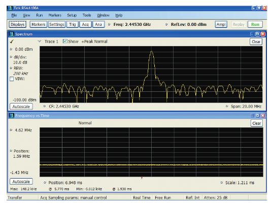 The amplitude vs. time display is one of the analyses which use the “analysis” subset of the acquisition record. This display is equivalent to the “zero-span” setting in the traditional swept analyzer. This display has its own “Time Domain Bandwidth”filter which can be used to reduce the bandwidth of this measurement for noise reduction or glitch reduction.