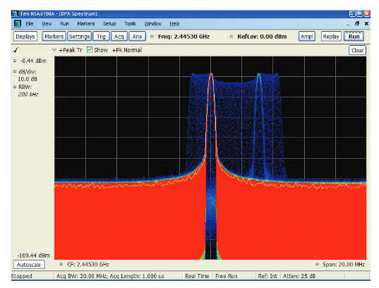 The RSA Series enables DPX™ Live RF spectrum display on up to 800 MHz acquisition bandwidth. The name DPX comes from the concept of a “Digital Phosphor Technology” display, which re-creates the slow-fade memory effect of a CRT phosphor. For the RSA, the hardware processor performs up to 292,969 FFTs per second. This gives continuous real-time visibility of varying RF signals without interruption. Figure 9 is a radar pulse with an interfering carrier sweeping through the pulsed spectrum.