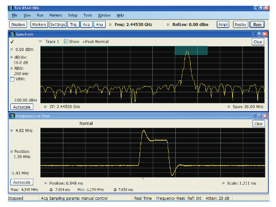 When installed on an oscilloscope, the internal software limits on setting frequency coverage, bandwidth, and record length automatically adjust to use the frequency and memory limits of the oscilloscope on which it is installed. The SignalVu vector signal analysis software provides control of the oscilloscope attenuator, gain, sampling rate and sweep rate controls by allowing the user to control “Reference Level,” “Frequency Span” in a manner with which spectrum analyzer users are familiar.