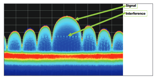 An ordinary analyzer does not have enough spectrum measurements, nor does it combine them so as to be sure not to miss the effects from any one of them.The DPX spectrum display can see all of the spectrum effects. Note how the stepping LO harmonic is easily visible even inside the spectrum lobes of the pulse transmitter. When viewing this on a real RSA Series spectrum analyzer (not a still image as shown here) the Live RF view really makes the interference more visible yet, as the visibility is improved by its movement inside the stationary pulse spectrum.