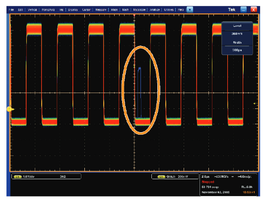 The FastAcq display on the oscilloscope can discover baseband pulse time-domain transient errors. Figure 4 shows just one single pulse that has a narrower pulse width than even hundreds of thousands of correct pulses. The blue color on the temperature scale representation of signal persistency represents the least frequent occurrence, while the red areas are the parts of the signal that are the same every time.