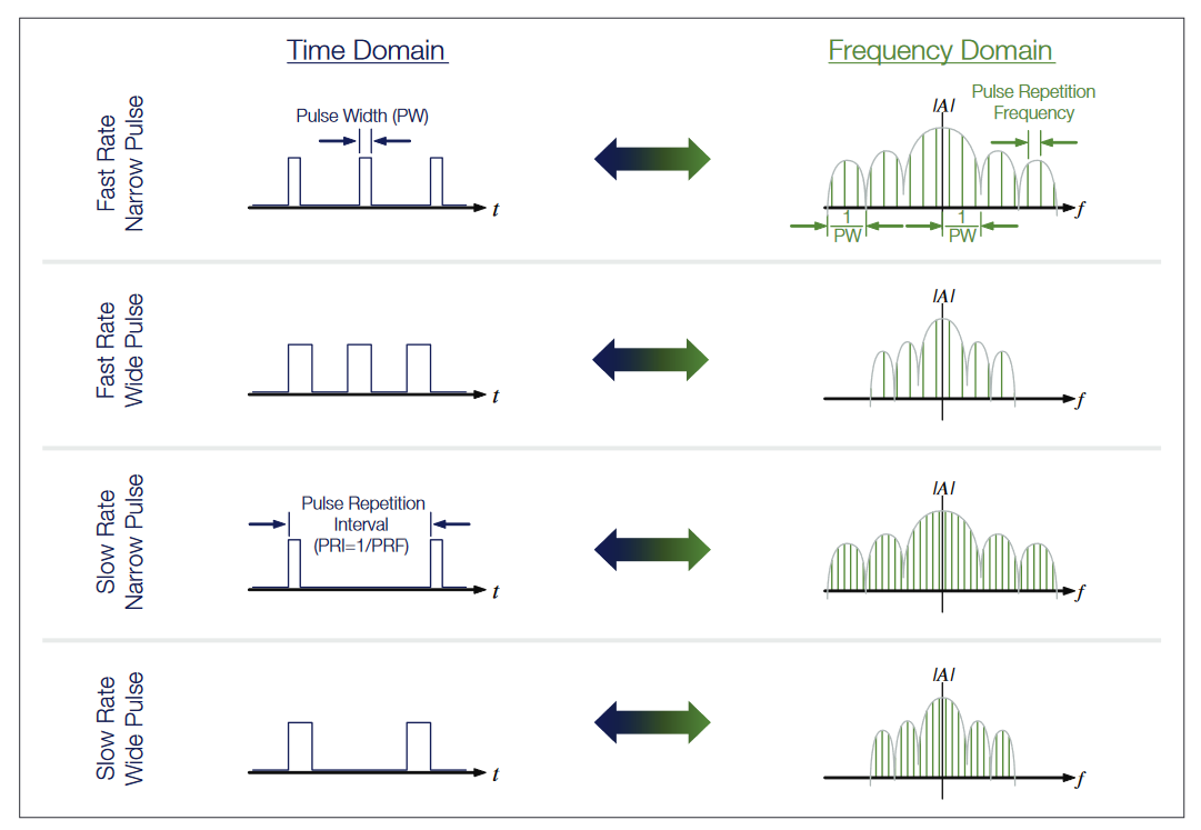 To understand the best measurement device, we need to understand the signals we are dealing with. First, we assume a sensor (Radar) or an ECM is mostly characterized as a time domain phenomenon, as fundamentally we are dealing with the transmission of a quantity of electromagnetic energy that illuminates a target - we then measure the time it takes for the reflected residual energy to arrive back at the receiver. The signal could be a continuous wave or a sequence of pulses with a specific mission goal. However, pulse rise and fall times, the type of modulation and the behavior of the transmitter amplifier and most importantly the frequency of transmission can create a broad range of responses that need to be considered.