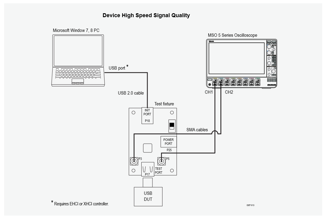 • A real-time oscilloscope with a bandwidth of 2 GHz or higher for high speed USB signals, or an oscilloscope with a bandwidth of 350 MHz or higher for low and full speed USB signals.