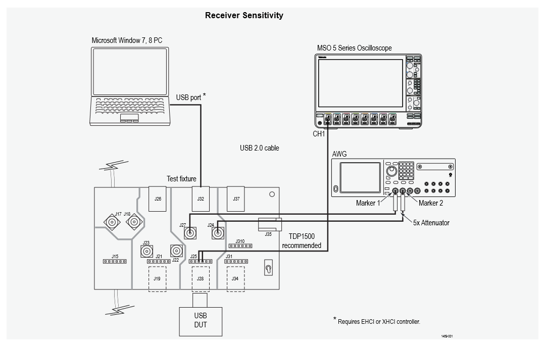A signal source is required for the receiver sensitivity test. The Tektronix AWG5000 Series and AWG70000 Series are excellent signal sources for USB receiver sensitivity tests. The setup files required to perform USB 2.0 receiver sensitivity tests for these signal sources are available from Tektronix.