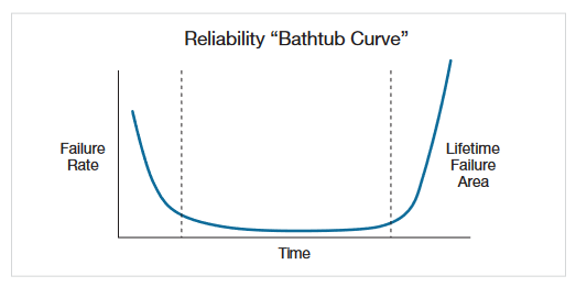 Stress-measure testing is a technique commonly used to evaluate operating lifetimes and wear-out failure mechanisms in semiconductor devices. This testing is focused on failures on the right-hand side of the typical failure rate bathtub curve (Figure 1), that is, failures that aren’t associated with infant mortality or manufacturing failures.