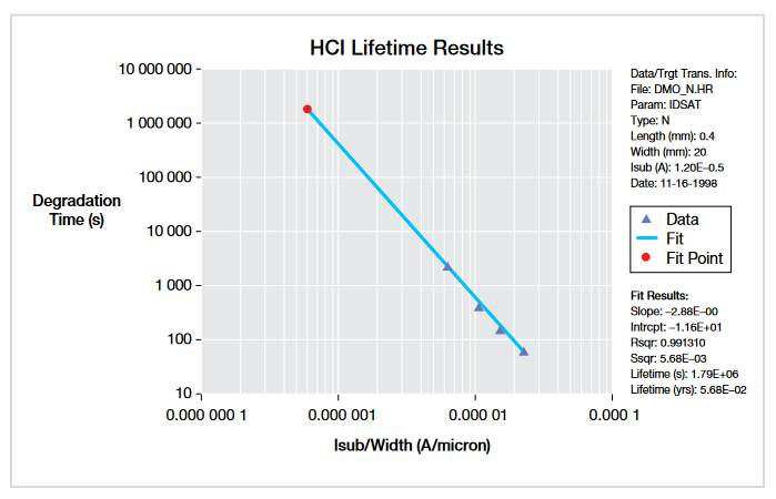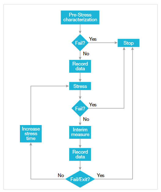 A typical HCI test procedure consists of a pre-stress characterization of the DUT, followed by a stress and measurement loop [11] (Figure 4). In this loop, devices are stressed at voltages higher than normal operating voltages. Device parameters are monitored between stresses and the degradation of those parameters is plotted as a function of accumulated stress time (Figure 2). Prior to conducting this stress and measurement loop, the same device parameters are measured to serve as baseline values.