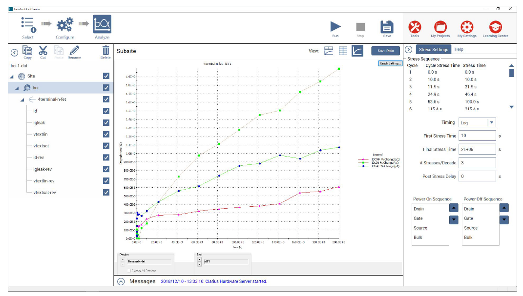The Clarius+ software tool set supplied with the 4200A-SCS system includes a set of example projects for WLR testing. The projects include a stress–measure loop with configurable test- and project-level exit logic and a site loop for stepping through sites on a wafer [10]. Figure 3 shows the HCI sample project. The graph shows a particular parameter being tracked over time, with each dot representing a different measure cycle after a stress cycle. The left-hand window is the sequencer, which shows the order of measurement tests and the overall structure of the project. Several projects for WLR testing are in the Clarius Project Library, including: