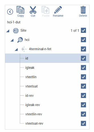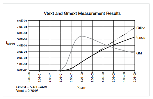 Hot carrier parameters monitored include VT, gm, IDLIN, IDSAT, and IDLEAK. These parameters are initially measured before stress and re-measured at each cumulative stress time. The IDLIN is the measured drain current with the device biased in the linear region; IDSAT is the measured drain current with the device biased in the saturation region. VT and gm can be determined using either constant current or extrapolation methods. In the extrapolation method, the VT is determined from the maximum slope of the IDS vs. VGS curve. Figure 5 shows a screen capture of the hci-1-dut project tests in Clarius. The 4200A-SCS’s Formulator Tool greatly simplifies extracting these parameters. Built-in functions include Differentiate to obtain gm, a MAX function to obtain the maximum gm (Gmext), and a least squares linefit function to extract VT (Vtext). The formulas to calculate these parameters can be found in the HCI projects supplied with the 4200A-SCS, and corresponding tests in test libraries. Figure 6 illustrates the Formulator’s automated data analysis capability.