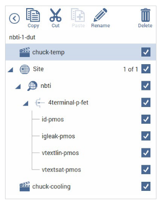 The project plan shown in Figure 8 includes actions to control the temperature of the chuck. The subsite plan will not start until the chuck reaches the specified temperature. After the first pre-stress cycle to perform characterization tests, subsequent cycles voltage stress the device for a specified period of time before again performing the tests. After the subsite plan is completed, the final step cools the chuck. In a parallel connection scheme, up to 20 devices can be stressed by voltage. Figure 7 shows an example of 20 parallelconnected devices being stressed by eight gate and drain voltages. See Table 3 for the NBTI test template available in the Clarius Project Library.