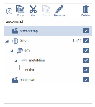 The em-const-i project plan template is shown in Figure 9. The subsite plan (em) is configured for subsite cycling using current stressing on the single device (metal-line).