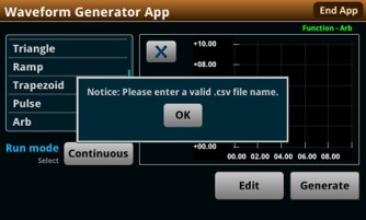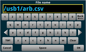 Save this file into the root directory of a USB flash drive and insert it into the instrument’s front panel. Select “Arb” as the desired function and input the file path into the “File name” string input (the input should follow the format: “/usb1/your_file_name.csv”).