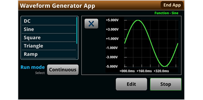 - Current Waveforms: The app can generate current waveforms in addition to voltage. When the app sources voltage or current, it will limit the complementary setting.