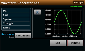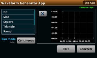 As previously mentioned, the SMU must generate one cycle of a waveform before being able to output it. Tapping “Generate” will begin the process of generating a function. The time for generation will vary based off the number of data points required to generate the waveform. In general, a lower frequency will result in a longer generation time. The app will display the “Generate” button whenever a change in waveform settings has created the need to develop a new config list.