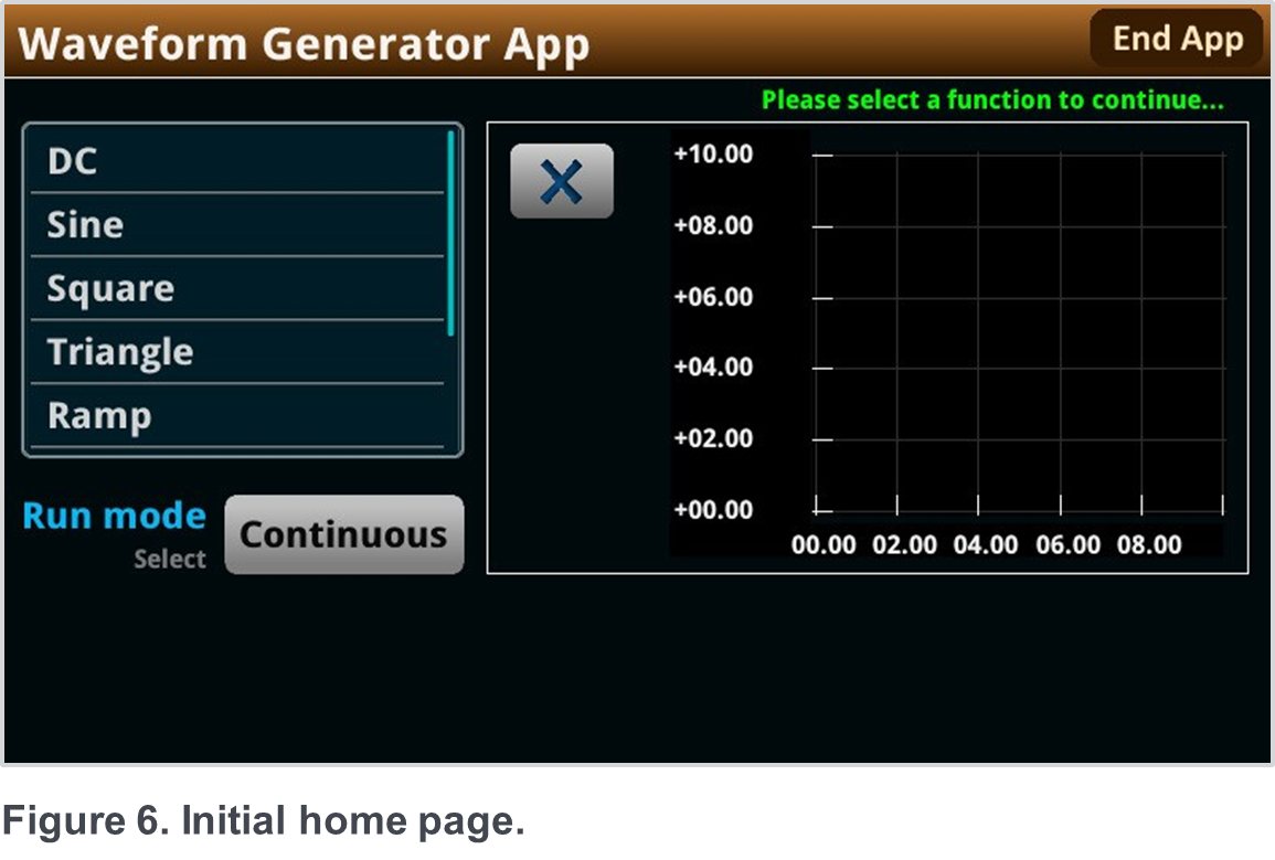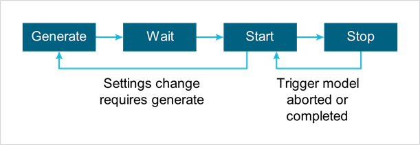 This trigger model cannot be interrupted while running. An app restart is necessary if the trigger is not set up correctly at this stage. To avoid disruption in your test flow, ensure that your trigger event is set up correctly prior to starting the output. When the trigger model has been executed, the app will return to the initiate stage shown in Figure 13.