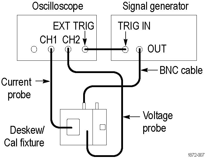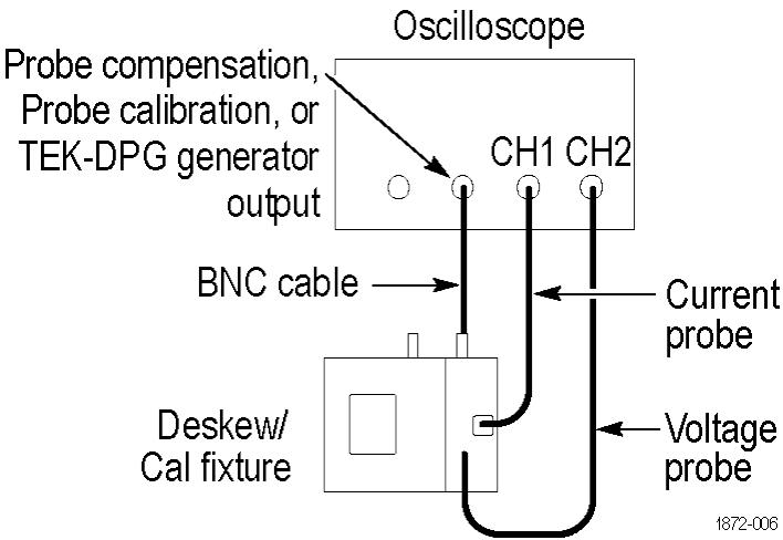 This fixture converts the oscilloscope PROBE COMPENSATION output (Probe Calibration on DPO7000C Series) or the TEK-DPG pulse generator output into a set of test point connections. These connections provide you with a convenient way to compensate for timing differences between voltage and current probes.