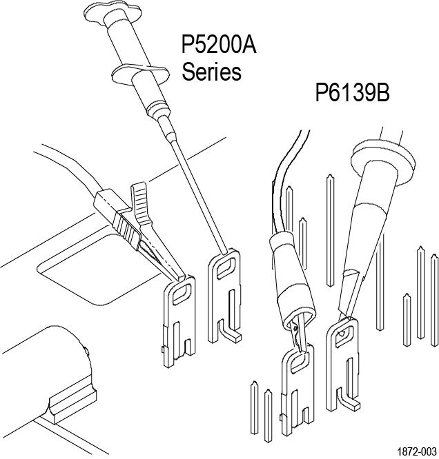 For P6139B or P5200 Series probes, connect the probe tip and the ground lead to the two terminals as shown.