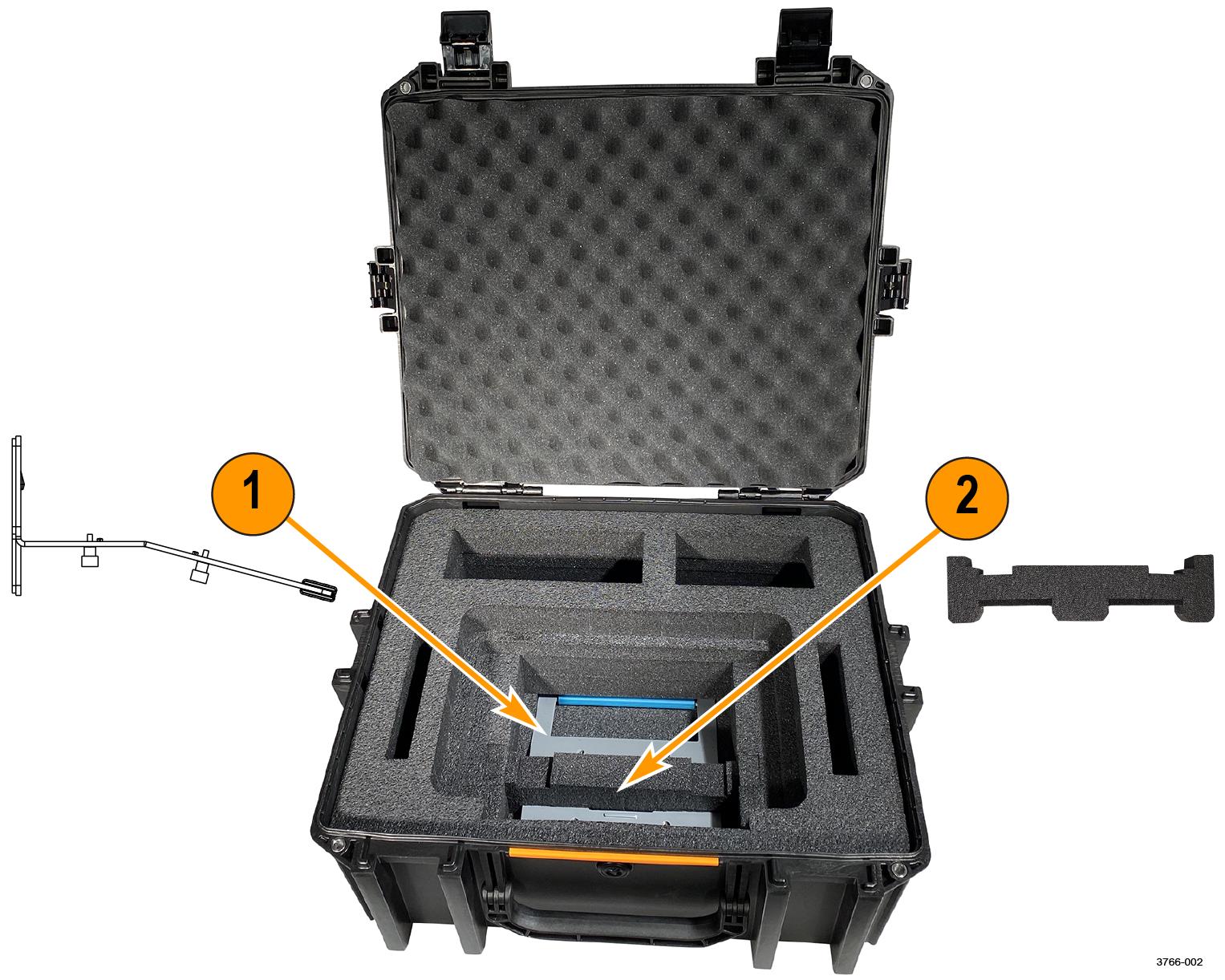 The 2 Series MSO instrument fits above the stand in the case with two foam inserts, depending on the attached accessories.