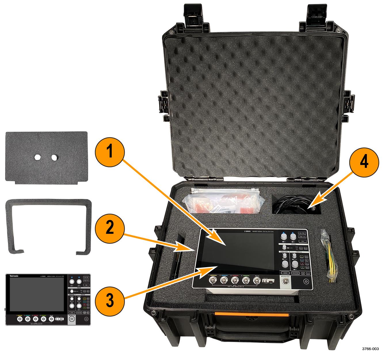 The case protects instruments from shock, vibration, and moisture. It also has room for the accessories such as; AC-DC power supply, power cord, external ground cable, probes, DUT boards, and documentation.