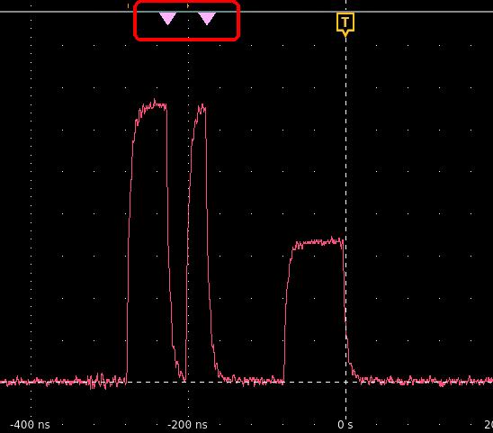 Note:You cannot search for sequential events (there is no Sequence search type). - The searched waveform is marked with one or more triangles as soon as the search criteria becomes true. Each search uses a different color for its markers. The example image shows search criteria set to find positive pulse widths that are less than 70 ns wide.