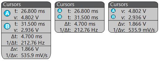Cursors are on-screen lines that you can move to take measurements on specific parts of a waveform or between two different waveforms. Cursor readouts show both current position values and the difference (delta) between cursors. Polar cursor readouts are available through the cursor configuration menu for XY plots.