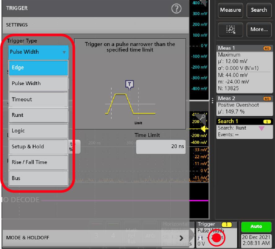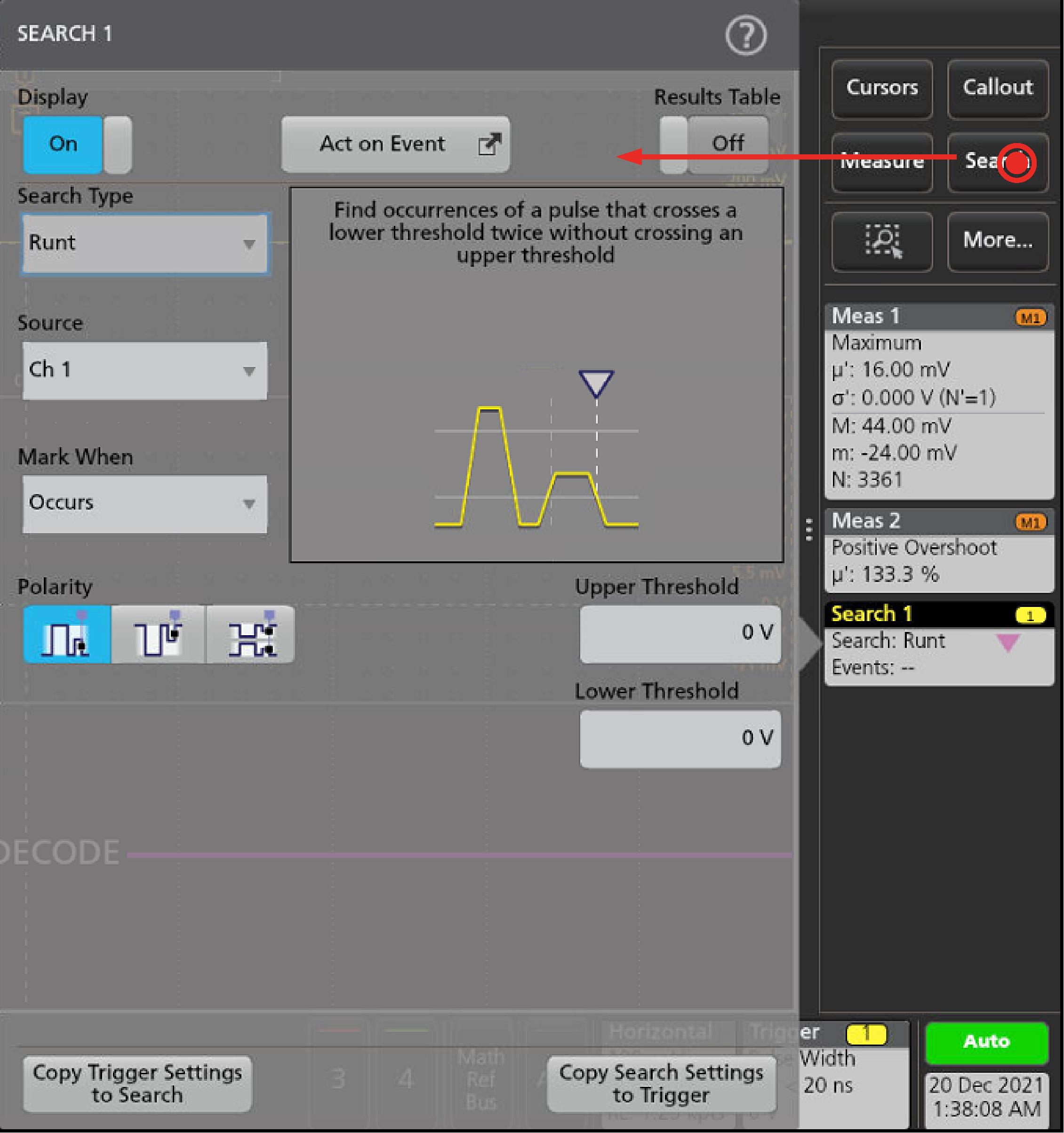 Prerequisite: Display the channel or waveform signal on which to search. The waveform must be displayed to create a search for it.