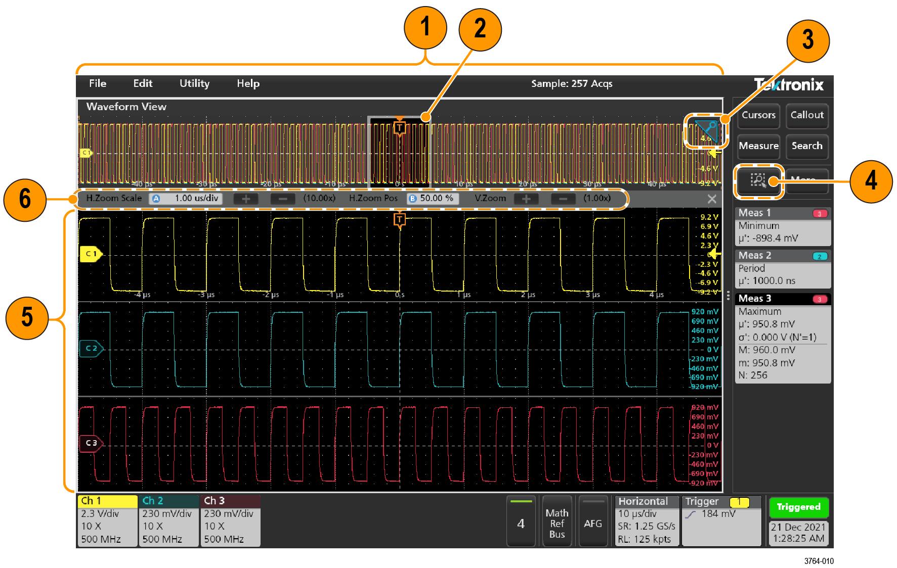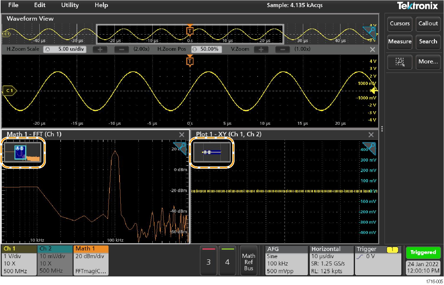 - To return the instrument to normal acquisition mode, tap the Zoom icon in the upper right corner of the Waveform View to turn off Zoom mode, and push the Run/Stop front-panel button to set it to Run mode.