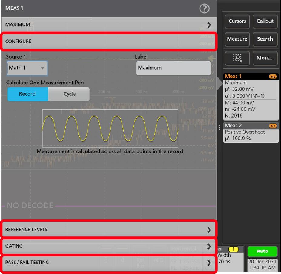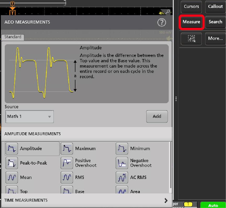 - Select a measurement category panel, such as Amplitude Measurements or Time Measurements, to display measurements for those categories.